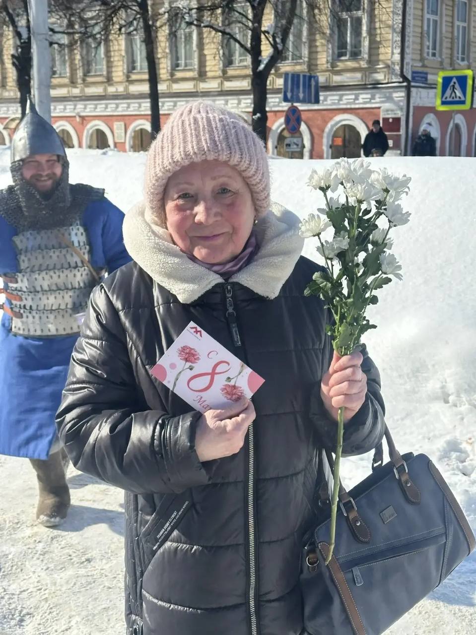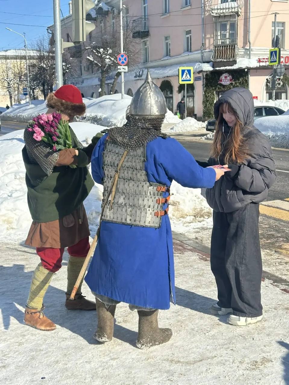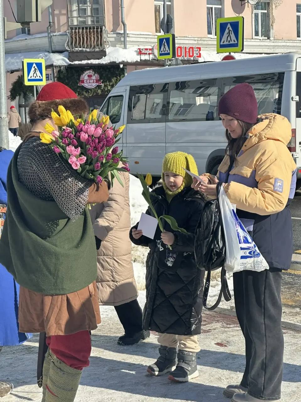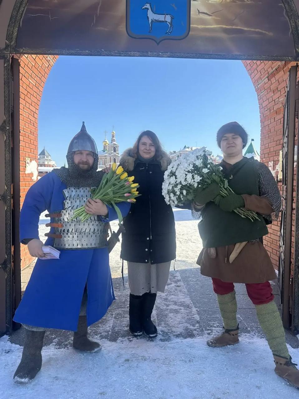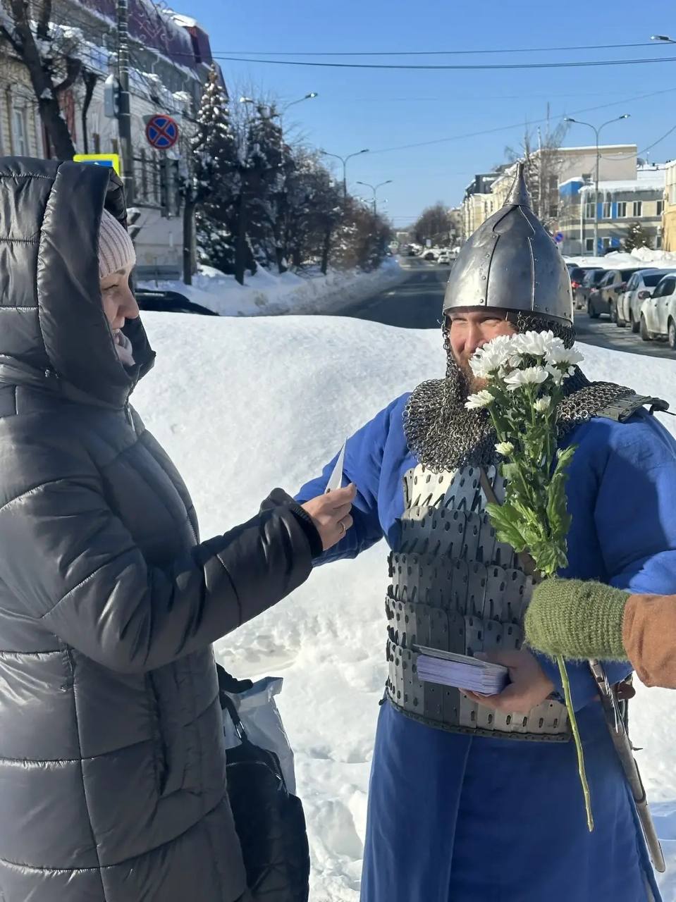 Галантные воины в доспехах дарили женщинам весеннее настроение: нежные тюльпаны и хризантемы, а также открытки с теплыми пожеланиями от главы городского округа "Город Йошкар-Ола" Евгения Кузьмина, врио мэра Антона Трудинова и его заместителей.