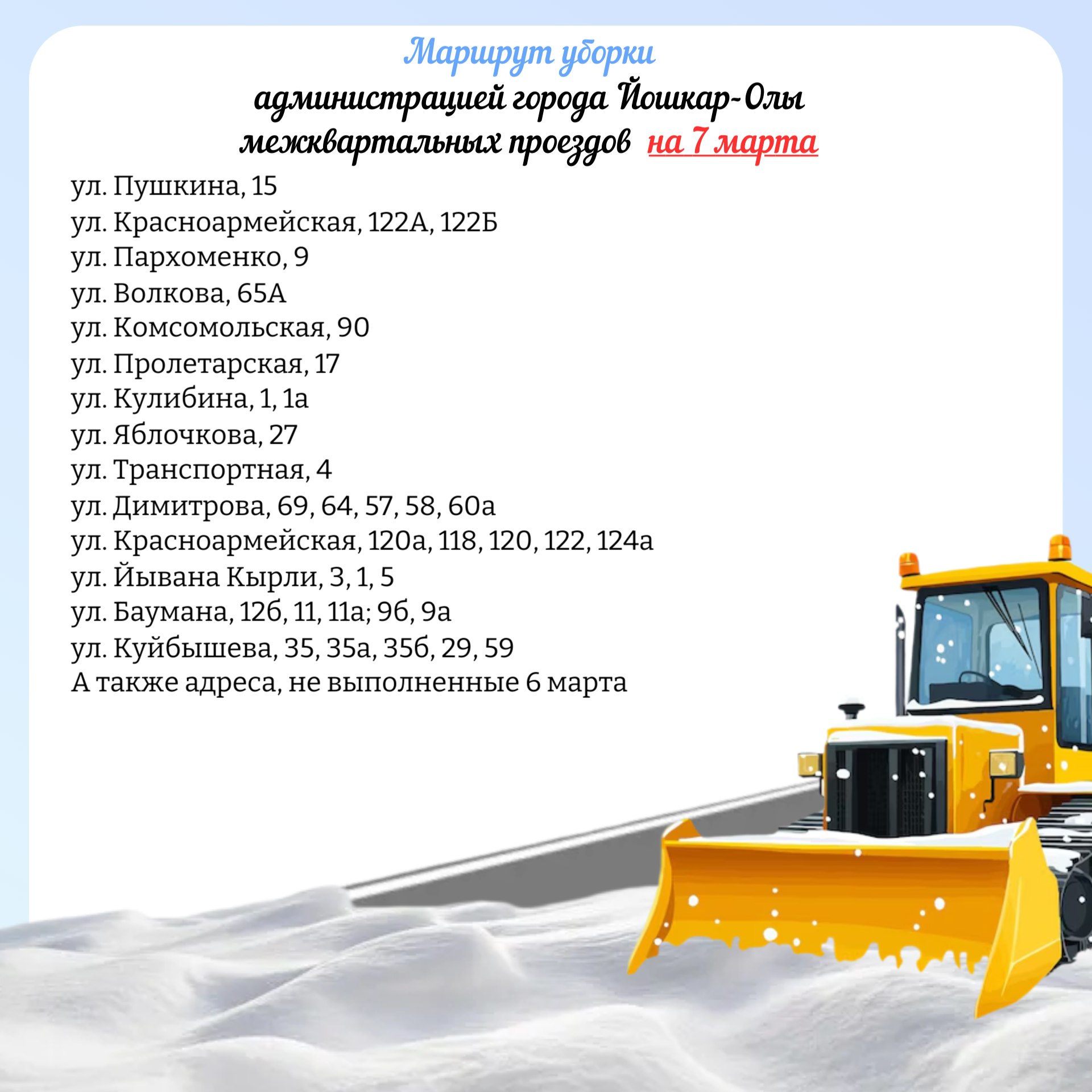 В мэрии опубликовали очередной график уборки снегоуборочной техники.