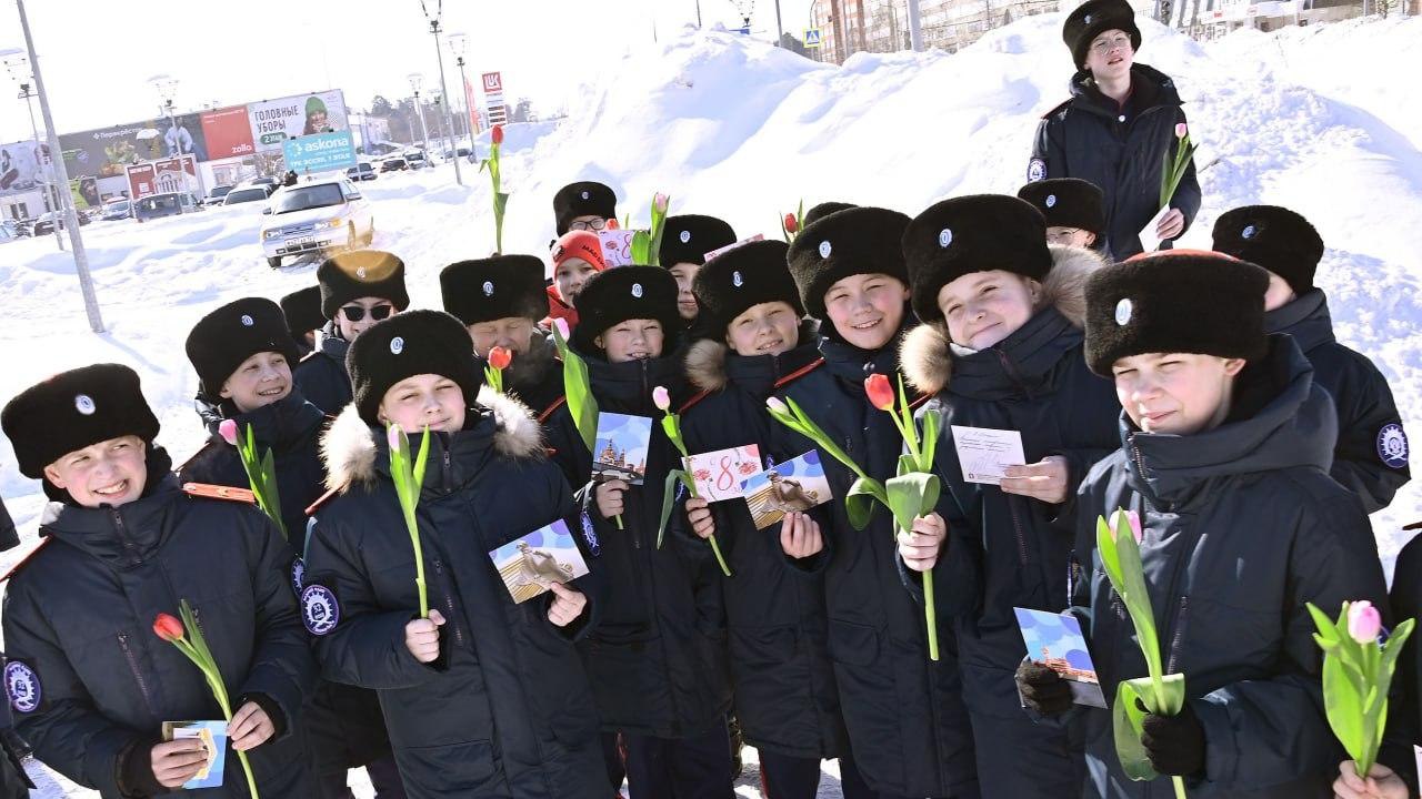 Женщин на улицах Йошкар-Олы поздравили казачата, юнармейцы и ТИЦ