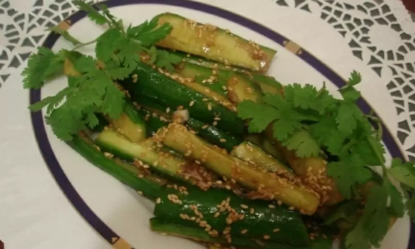 2. Чеснок пропустите через пресс и добавьте к огурцам. Затем посыпьте их жгучим перцем, сбрызните уксусом и соевым соусом, чтобы насытить ароматами. На последнем этапе раскалите растительное масло, снимите с огня и добавьте кунжут. Быстро перемешайте, чтобы кунжут изменил цвет — это будет знаком готовности.