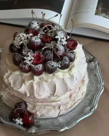 На каждый корж меренги выкладывается крем, повторяя процесс для трех слоев. В качестве украшения можно использовать свежие ягоды или фрукты, а также присыпать сахарной пудрой для дополнительного эффекта.