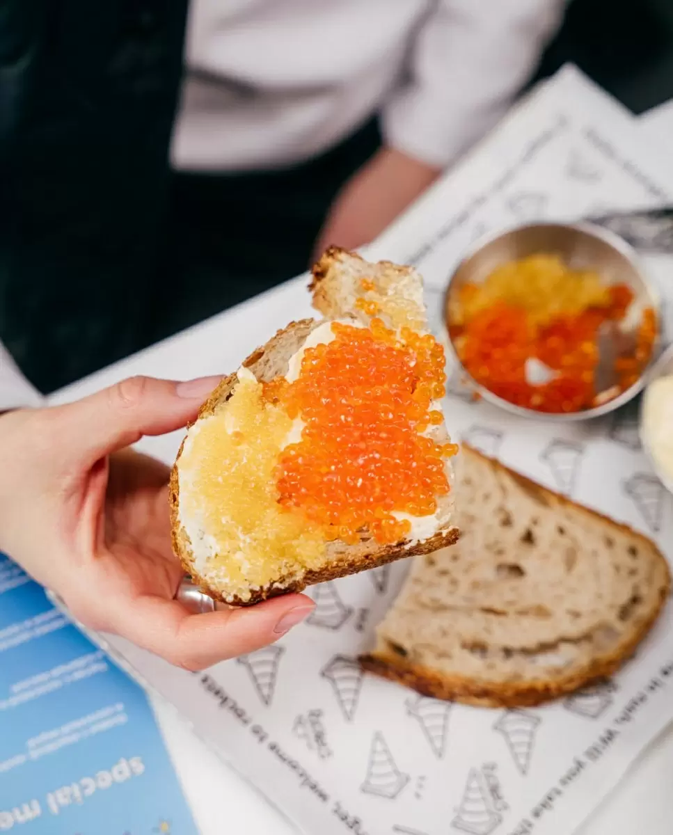 В рамках уютной очереди сезонов настроение меняется вместе с меню. На тарелке гармонично переплетаются морские и сливочные ноты: тартин с лососевой и щучьей икрой и мягкое взбитое масло добавляют легкость и тепло в холодный вечер.