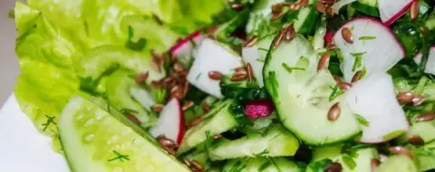 Приготовление этого салата займет не больше пяти минут. Огурцы и редис следует нарезать соломкой, а яйца мелко порубить. Все ингредиенты объединяются в салатнице, где им остается лишь добавить немного соли. Заправка из домашней сметаны придаст блюду нежность и богатый вкус.