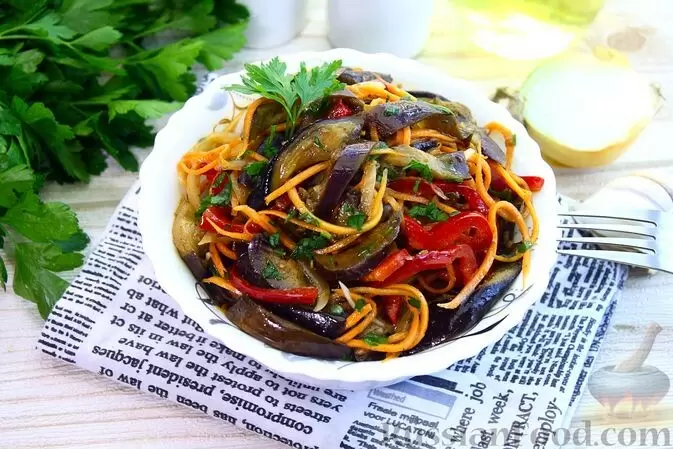 - Баклажаны по-корейски: пикантное блюдо с морковью и сладким перцем, дополняющее любой стол.