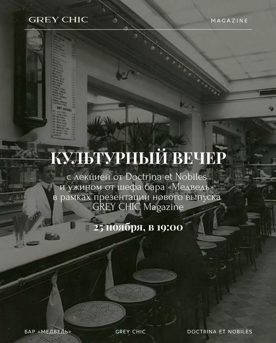 25 ноября в легендарном баре «Медведь» пройдет культурный вечер, приуроченный к презентации нового, восьмого номера журнала GREY CHIC. Это событие станет настоящим праздником для ценителей искусства, еды и интеллектуального времяпровождения.