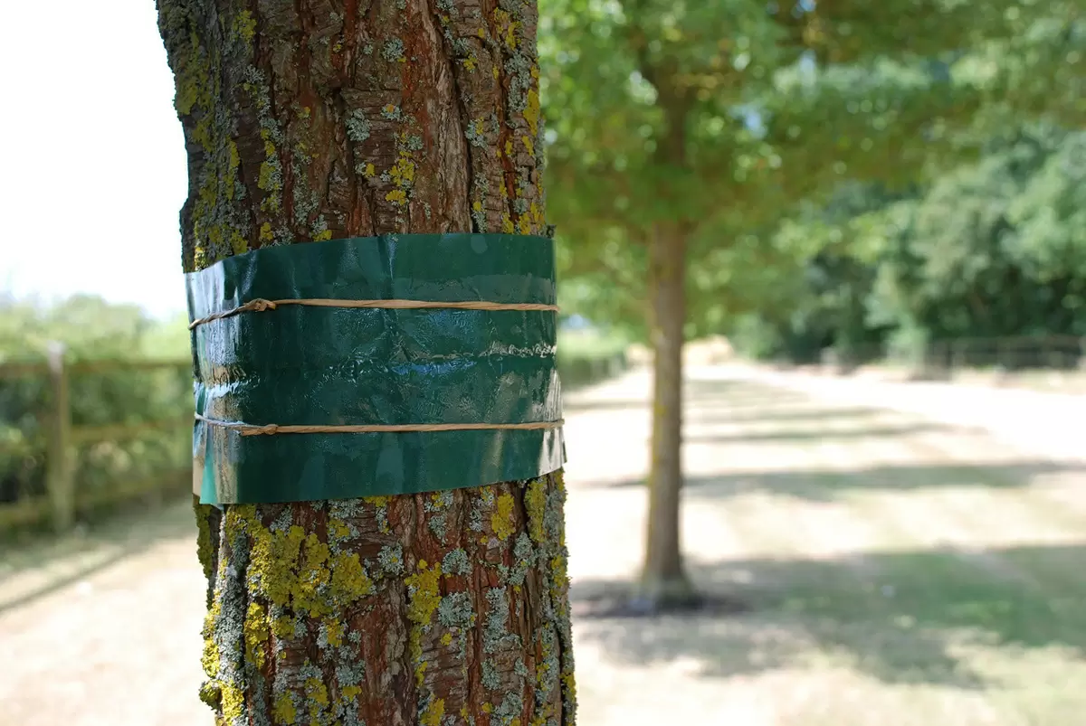 - Клеевой пояс: Отлично подходит для борьбы с тлей и муравьями. Клей наносят на основу, чтобы избежать повреждения коры.
