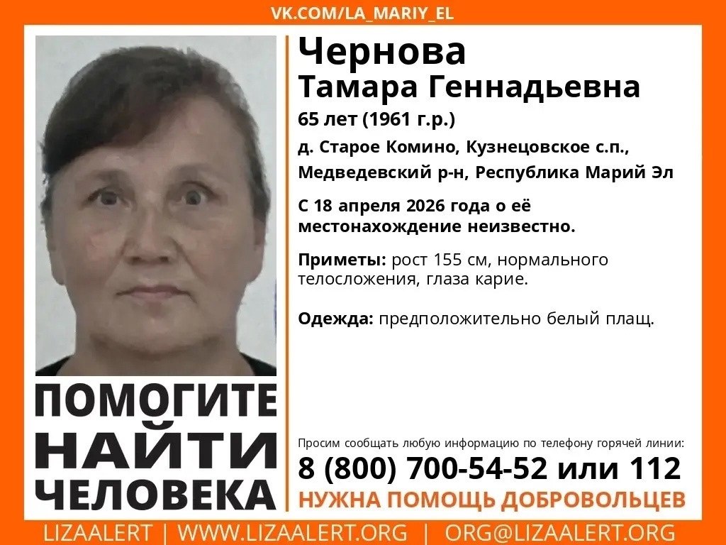 Чернова Тамара Геннадьевна ушла из дома 18 апреля, и до сих пор о её местонахождении ничего неизвестно.