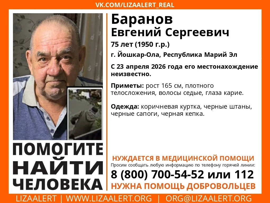 Местонахождение жителя столицы Марий Эл Евгения Баранова неизвестно с 23 апреля 2026 года.
