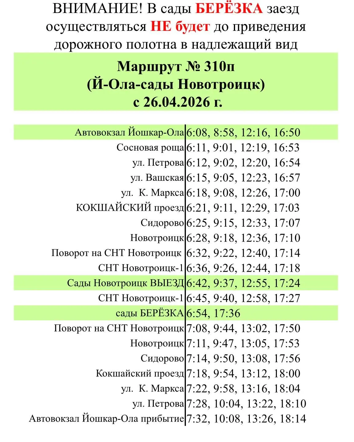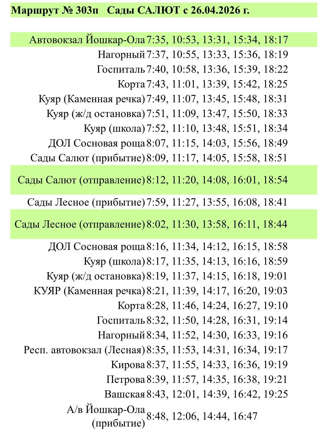 ГУП РМЭ «ТТ» публикует график работы сезонных автобусов№303-П «Республиканский автовокзал - сады Салют» и №310-П «Республиканский автовокзал - сады Новотроицк». Они начали ездить с 26 апреля.