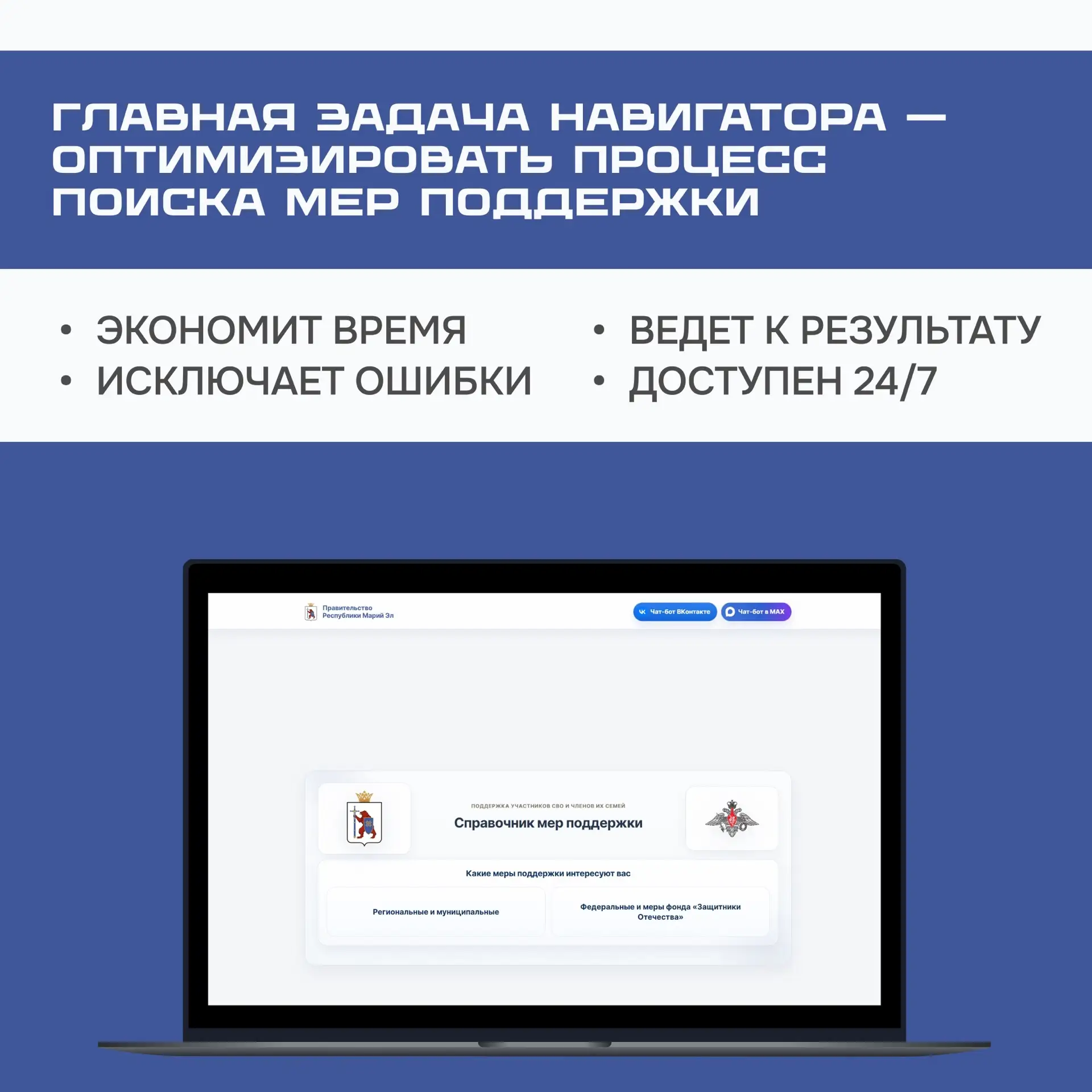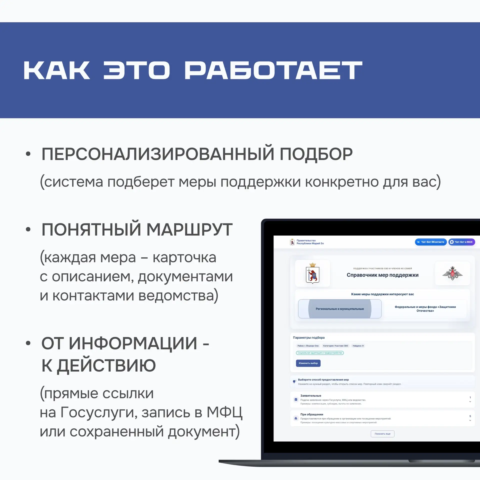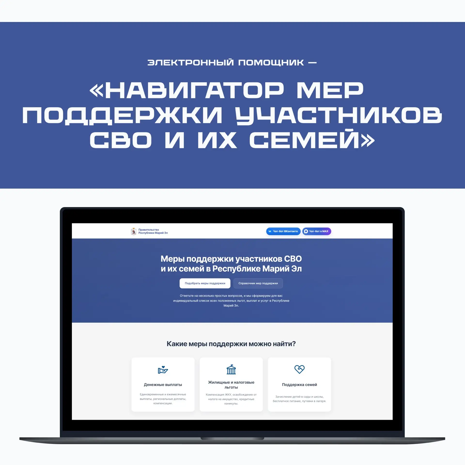 По поручению Главы Марий Эл Юрия Зайцева был разработан и запущен электронный сервис — «Навигатор мер поддержки участников СВО и их семей». Он доступен на портале Правительства республики: clck.ru/3TK5EB