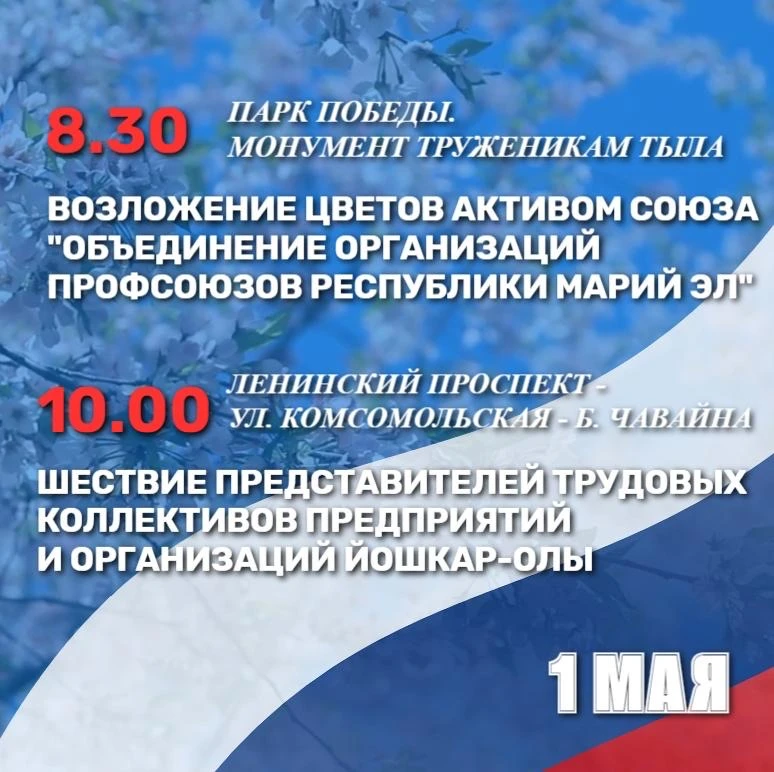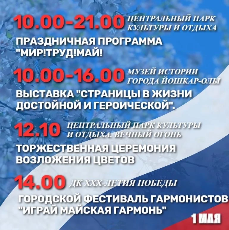 С 10 до 21 часа в Центральном парке будет проходить праздничная программа «Мир! Труд! Май!», а с 10 до 16 часов в музее истории города Йошкар-Олы каждый желающий сможет посетить выставку «Страницы в жизни достойно и героической». В 12:10 пройдет торжественная церемония возложения цветов у Монумента Воинской Славы, а в 14:00 стартует городской фестиваль гармонистов «Играй майская гармонь».