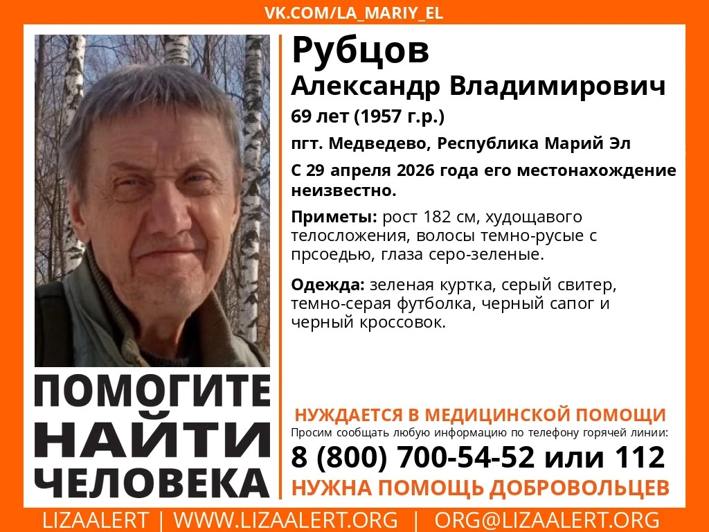Местонахождение Александра Рубцова 1957 года рождения неизвестно с 29 апреля 2026 года.